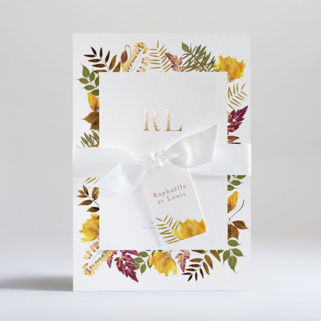 - Photo ou illustration ? Si vous faites une photo de couple dans un décor automnal, cela apporte une forte identité. Sinon, les motifs de feuilles, fleurs séchées ou feuillage stylisé offrent un caractère plus artistique ou bohème.