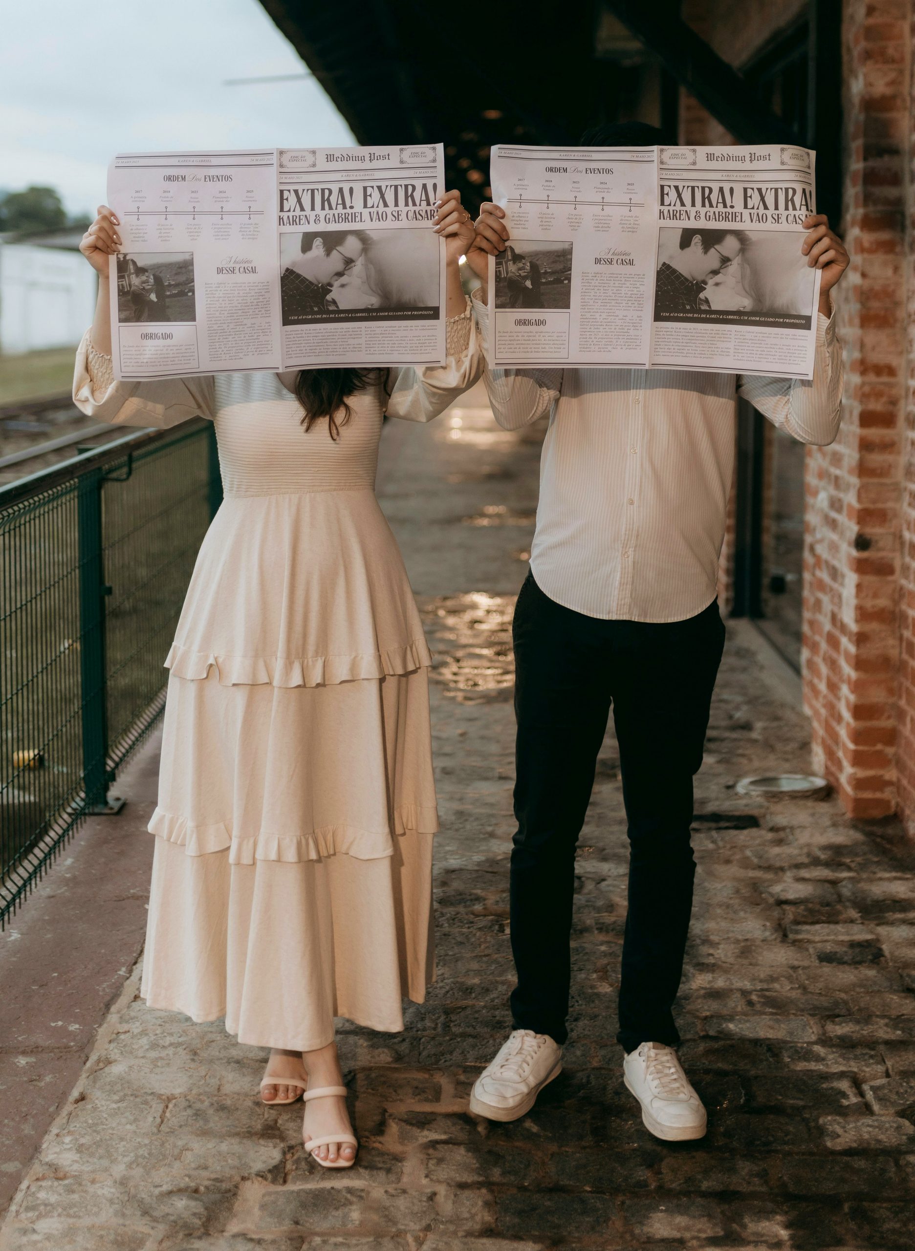 - « Une du journal » : annoncez votre mariage comme un événement historique avec un gros titre accrocheur : « Sarah et Thomas unissent leurs destins » ou « Le mariage du siècle approche ! ».
